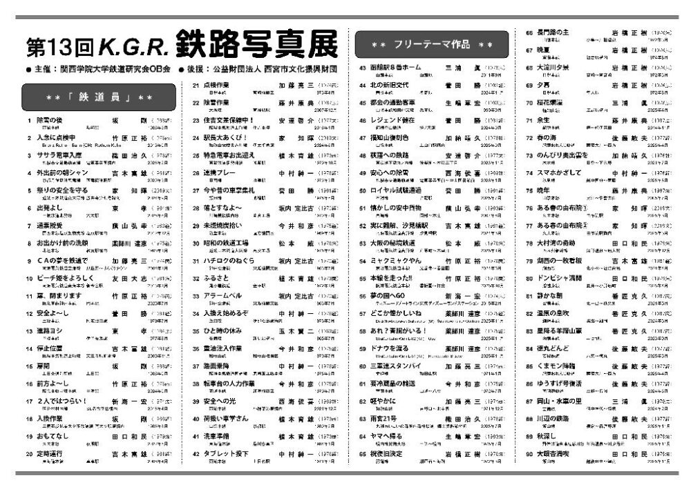 昨年に引き続き、今年も関西学院大学鉄道研究会OB会主催で「第13回K.G.R.鉄路写真展」を 開催いたします。今回の特集テーマは鉄道で働く人々にスポットを当てた「鉄道員」です。鉄道員といえば日頃ごろ私達が利用する時に接することが多い駅員や車掌・運転士を思い浮かべますが、車庫で車両の点検や整備を行う人々、線路や信号設備の維持管理に当たる人など様々な業務に多くの職員が携わっています。そしてこれらの鉄道員に支えられて公共交通機関としての使命を果たしています。一方近年は自動改札・タッチ決済やワンマン運転が都市路線・ローカル線を問わず普及し鉄道員を目にする機会が少なくなったことも事実であり時代の流れを感じざるを得ません。